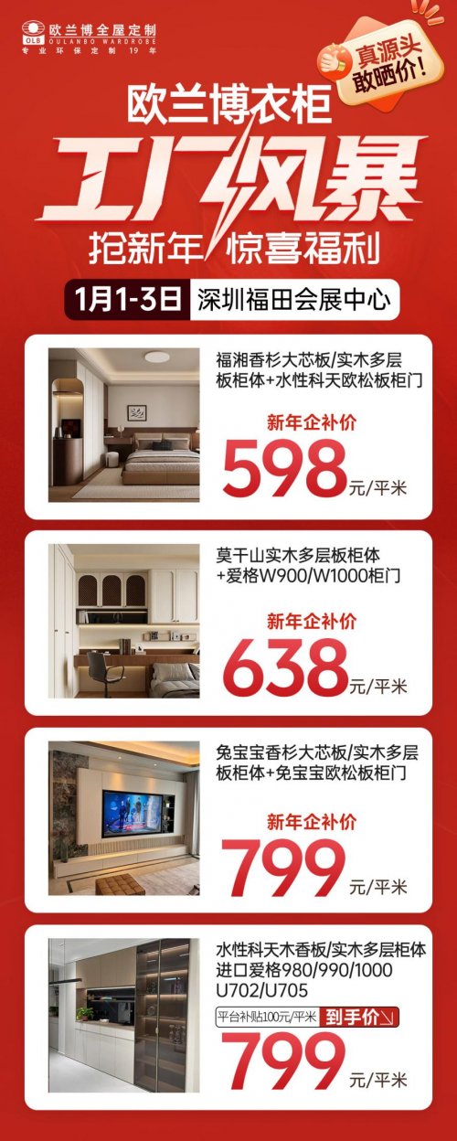 欧兰博负责人表示:“此次‘工厂风暴’打破传统定制溢价,用透明价格+环保板材+大牌基材组合,让业主花更少预算装出高品质新家。”有装修需求的装修业主可于1月1-3日前往深圳福田会展中心7、8号馆,实地体验产品并锁定优惠。