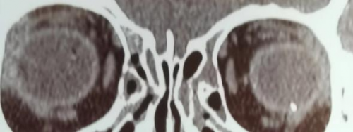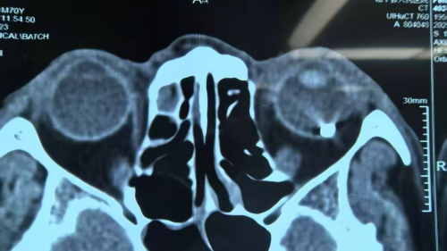 次日,彭叔左眼症状没有好转,便赶忙前往当地医院就诊。经过左眼CT检查,结果显示左眼球偏外侧存在高密度影,医生考虑有异物残留。但当地医院受限于医疗条件,无法对其进行有效医治,于是建议彭叔转至上级医院做进一步治疗。